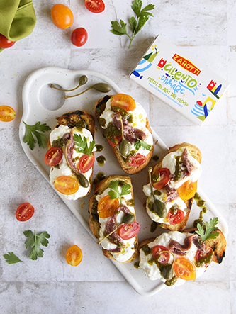 Guarnite le fette di pane con la stracciatella, i pomodorini a piacere, i filetti di alici Zarotti e il pesto di capperi preparato.